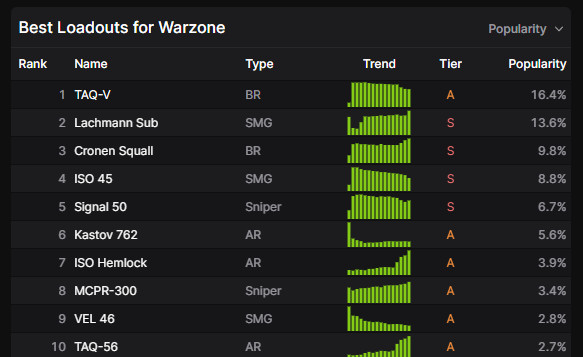 A Combat Records és a hozzá tartozó API Season 2-ben élesedett, így már sokkal részletes statisztikákkal is szolgálhatunk. Ám abban biztosak lehetünk, hogy a jelenlegi TOP 5 fegyvert nem igazán kérdőjelezi meg senki. A WZRanked weboldalának sikerült a legjobb fegyvereket felsorakoztatnia, így már most pontosabb adatokkal is rendelkezünk, bár közel sem annyival, mint az eredeti kliens esetén: