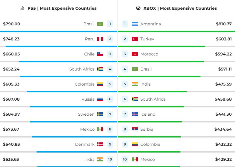 A sokk inkább akkor következik be, ha összehasonlítjuk a legmagasabb PS5-árfolyamok világranglistájának sereghajtóit (vagyis ahol a legolcsóbb a konzol) és élbolyát (ahol a legdrágább). A készülékért még nekünk magyaroknak is szívfájdító látni, hogy mennyivel kevesebbet szurkolnak le a tehetősebb japánok és kanadaiak. A két ország átlaga szerint arrafelé 384,5 dollárból (136 ezer forintból) kihozható a boltból egy PS5. De ugyanezért egy brazil és egy perui gamer már KÉTSZERES árat, átlagosan 770 dollárt (273 ezer forintot) fizet.