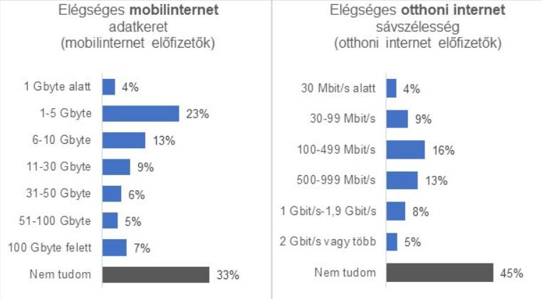 A kutatás legszembetűnőbb eredménye az, hogy a hazai előfizetők harmadának (33%) fogalma sincs róla, mennyi lenne számára az elégséges mobilinternet. Ez az arány sokkal rosszabb, ha otthoni internetről van szó, mert csaknem a megkérdezettek fele (45%) képtelen volt közölni, hogy mekkora sávszélességet igényelne.