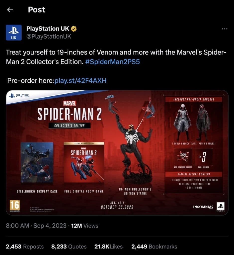 Mivel a megjelenés október 20., így érthető módon a közösségi médiában is szeretnék még ellenállhatatlanabbá tenni a játékot a Sonynál. Így hát úgy döntöttek, hogy amíg a készlet tart, promózzák az egyébként igen mutatós gyűjtői kiadást, amibe egy majd’ 50 centis, az előbb említett Venom szobor is helyet kapott.