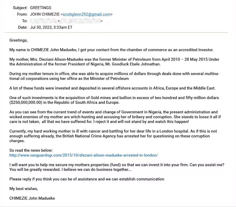 A scam visszatéréséről „A nigériai herceg él és jól van” címmel írt elemzést az Abnormal Security. A kiberbiztonsági cég feltárta: a magát Chimzie John Maduekének hívó nemesember szintet lépett és üzleti szereplőket is szeretne bepalizni. A levele még mindig arra a történetre építve adagolja be, hogy miért jársz jól az együttműködéssel, amit évekkel ezelőtt terjesztett, valószínűleg ugyanez a bűnözői csoport. A gyanútlan áldozatok akkor abban a hiszemben utaltak pénzt a hercegnek, hogy az ennek segítségével visszaszerzi a tőle elvett mesés örökséget, majd busás kamattal fizeti vissza a kölcsönt.