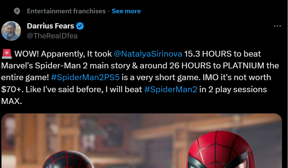 Összehasonlításképpen az első Marvel’s Spider-Man rész kimaxolása szintén nagyjából 35 órát vesz igénybe, szóval nem igazán értem a problémát. Arról nem is beszélve, hogy a játék teljesen jó szórakozás volt, és a hossz a játékstílustól is függ.