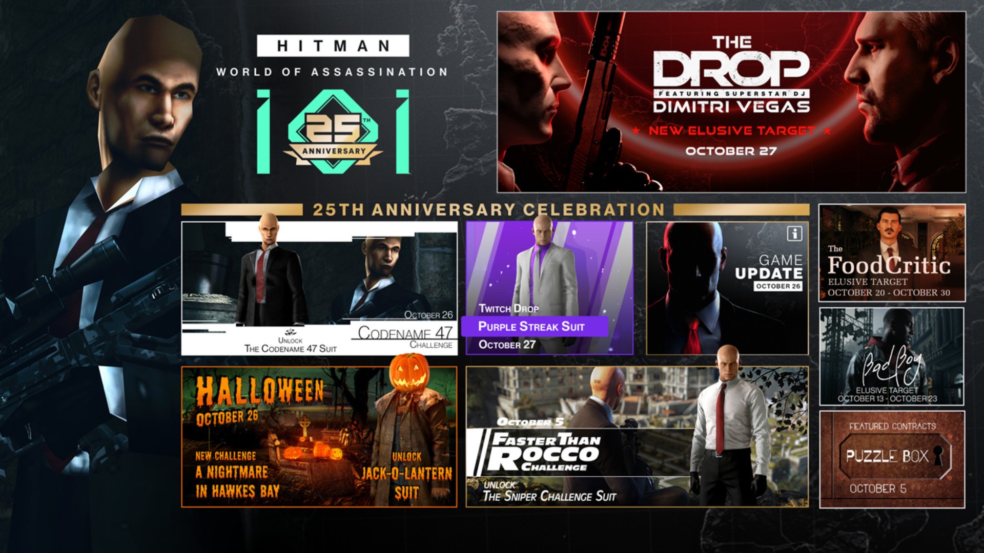 A 25. évfordulós ünneplés nem csak ebből áll. Október 5 és 27 között rengeteg új tartalom érkezik a Hitman: World of Assassinationbe. Új küldetések, kihívások, felszerelések, sőt Twitch Drop is várható.
