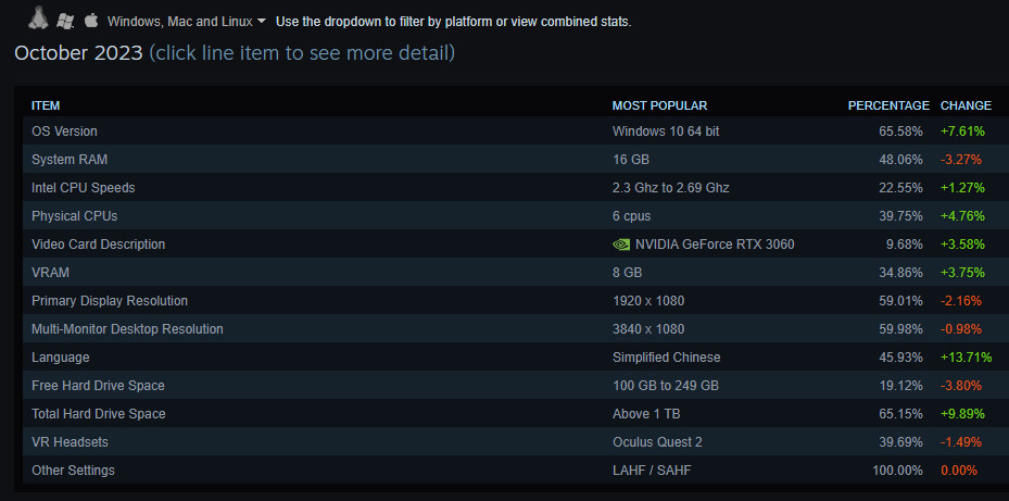 2023.11.03. – Manapság, amikor a videokártya-piac kezd kicsit helyreállni, sokszor előkerül az a kérdés, hogy mit értünk az “átlagos” gaming PC kifejezés alatt. Ezt meglehetősen nehéz lenne megválaszolni, hiszen egy többmilliós gép tulajdonosa teljesen mást értene ezalatt, mint az, aki 2010 óta ugyanazt a PC-t használja. Ilyenkor érdemes valamilyen statisztikához nyúlni, talán a legjobb választás a szinte minden gépen ott figyelő Steam lehet.