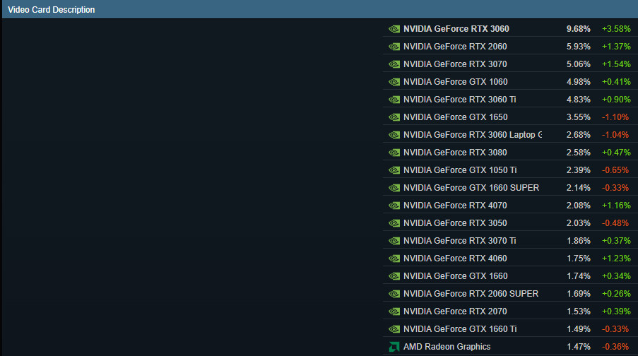 Hosszú hónap ok, talán évek GTX 1060 PC-s uralma után megtört a jég 2023 elején, sokáig a GTX 1650 vezetett minden kategóriában. A csökkenő áraknak köszönhetően egyre több játékos gépébe került aktuális generációból származó GPU. A márciusi gyűjtés azonban itt is jelentősen eltérő adatokat mutatottA GTX 1650 már sehol nem volt, a 3060, 2060 és 1060 triója uralta a virtuális dobogót. Az adatok tisztogatásával ismét a GTX 1650 került az élre, ezt az egységet követi a 1060 és a 3060, ezek sorrendje júniusra sem változott.