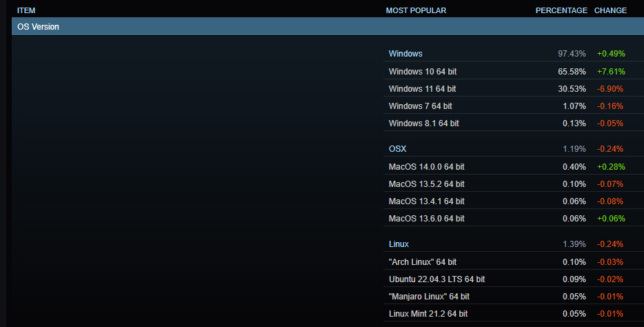 A Windows 10 népszerűsége lassú mértékben, de folyamatosan csökkent egy ideig, mely nem is volt meglepő. A kihívó házon belül érkezett a Windows 11 személyében. 2022 Novemberére azonban valami megtört, veszíteni kezdett a népszerűségéből az új verzió, míg a Windows 10 és 7 erősödni tudott. A meglehetősen kemény gépigénynek köszönhetően még akár hosszú évekbe is beletelhet az elkerülhetetlen váltás, előbb-utóbb a Windows 10 támogatása is megszűnik majd. Idén is folytatta menetelését a Windows 11, március elejére már átlépte a 32%-os határt. Ez az érték januárban még csak 30% volt. Áprilisban azonban brutális csökkenést olvashatunk le, alig 22% volt csak a Windows 11 felhasználók aránya Steamen.