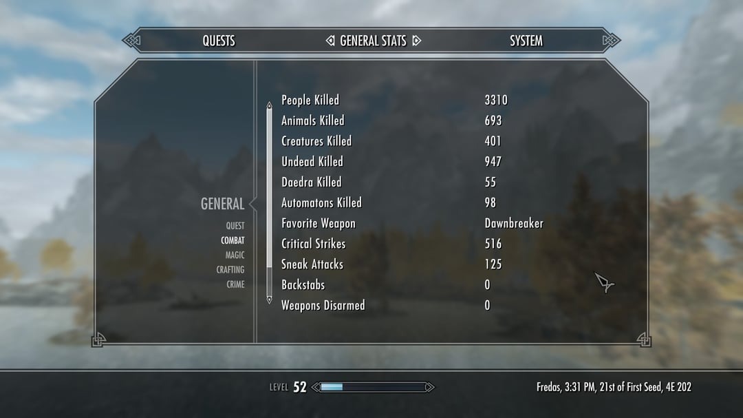 Aztán ott vannak azok, akik valószínűleg már látták a játék minden szegletét, de még ennél is nagyobb kihívásra vágynak. Amelix34 például arról posztolt a játék subredditjére, hogy sikeresen kivégezte a teljes „Skyrim-univerzumot”. Fogta magát és elhatározta, hogy mindent, amit csak le lehet mészárolni, megteszi, legyen az ember, szörny, vagy éppen gépezet. Összesen 3310 emberrel, 693 állattal, 401 szörnnyel, 947 élőhalottal, 55 Daedrával, valamint 98 Automatonnal végzett. Vagyis több mint 5400 NPC-t tett el láb alól, amiért a játék 267 ezer arany vérdíjat tűzött ki a fejére. (Kár, hogy már nem volt kinek begyűjtenie ezt…)