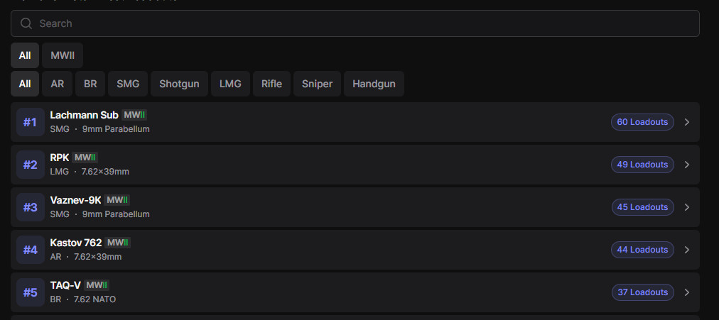 A Combat Records és a hozzá tartozó API Season 2-ben élesedett, így már sokkal részletes statisztikákkal is szolgálhatunk. Ám abban biztosak lehetünk, hogy a jelenlegi TOP 5 fegyvert nem igazán kérdőjelezi meg senki. A WZRanked weboldalának sikerült a legjobb fegyvereket felsorakoztatnia, így már most pontosabb adatokkal is rendelkezünk, bár közel sem annyival, mint az eredeti kliens esetén: