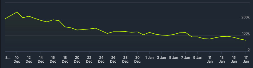 Persze tudtuk jól, hogy ez a szint tarthatatlan, hiszen sokan csak kipróbálni töltötték le a játékot, és kevés az esély rá, hogy mindenkit meg fog tudni győzni, ezért nem is lepődtünk meg, amikor az első hete után elkezdett csökkenni a játékosbázis. Előbb 200.000-re, aztán 150.000-re változott a Steamen egyszerre játszók száma, amiből december végére 120.000, 2024. januárjára pedig előbb 100.000-re, majd 90.000 főre esett a lélekszámláló. Január 17-én, alig egy hónappal a megjelenése után a SteamDB mérője 68.000 játékosnál tetőzött, és továbbra is csökkenő tendenciát mutat.