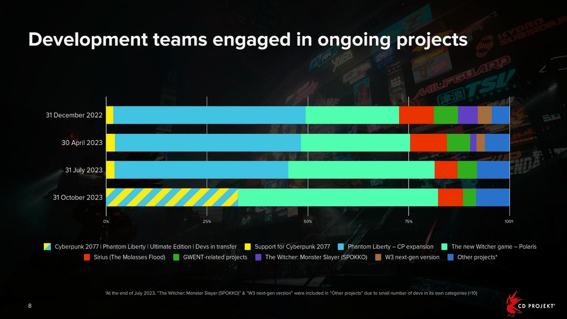 A CDPR még egy részéletes grafikonnal is szemléltette, hogy hova, s mikor helyezték a fókuszt az elmúlt negyedévekben. A Cyberpunk 2077 és a Phantom Liberty például dominált 2022. decembere és 2023. októbere között. Ám az utolsó időszakban a legnagyobb erőforrásokat már a Polaris kapta, akik az „új Witcher játékon” dolgoznak.