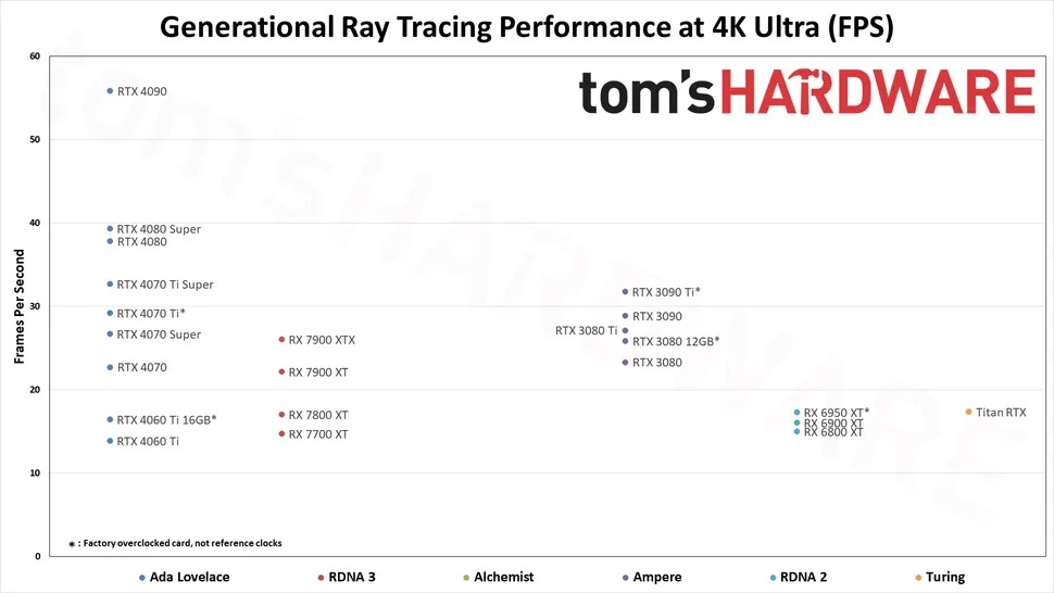 Az előző generáció győztese, az RX 6950 XT Ray Tracing alatt a 3080 szintjét sem éri el, a 3090 Ti-ról nem is beszélve. Ahogy az új RX 7900 kártyák sem vehetik fel a versenyt az Nvidia RTX 4080, 4090 modellekkel, de még a 4070 Ti kártyával sem. Az AMD ezen az oldalon egyértelmű hiányosságokkal szenved a mai napig. Tegyük hozzá, hogy többen megkérdőjelezik a Ray Tracing létjogosultságát, sokaknál mégis szempont lehet a megfelelő videokártya kiválasztásánál.