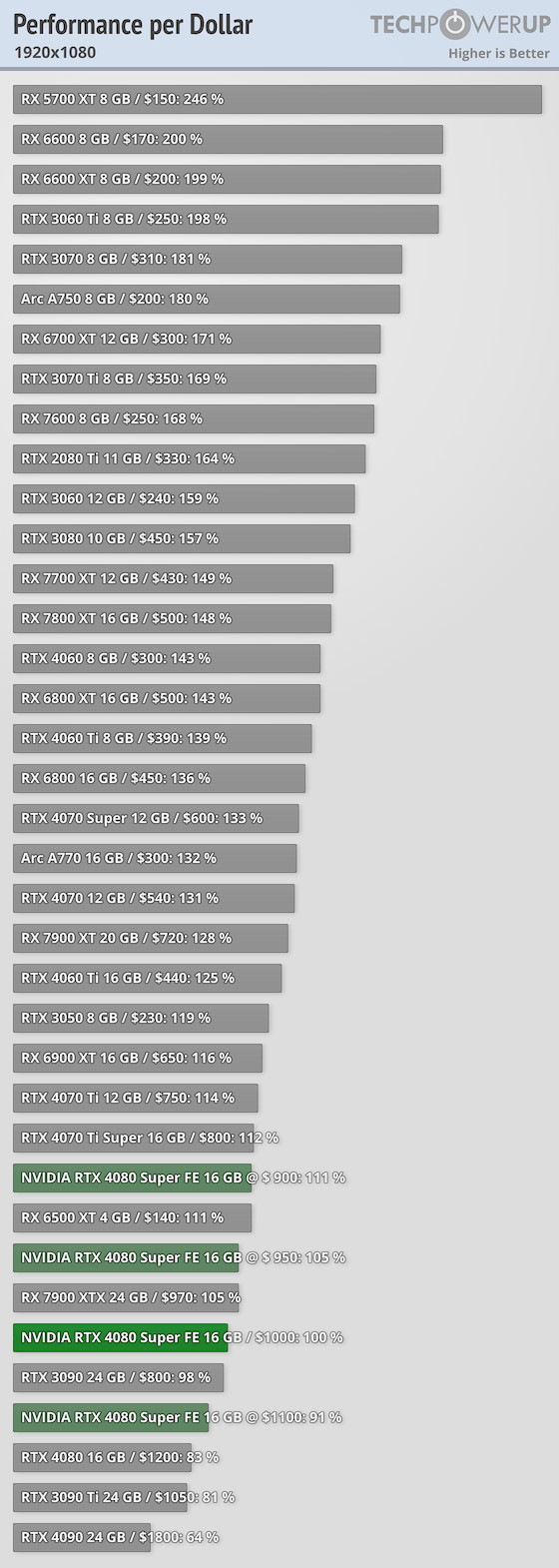 Szintén remek mutató lehet a dolláronkénti FPS érték. Ez azt adja meg, hogy egy adott kártya mennyire rendelkezik kellemes ár-érték aránnyal. A legfelső kártyák érik meg legjobban, míg a lista alján a legrosszabb ár-érték aránnyal rendelkező példányokat találjuk. Bár hazánkban az árak eltérnek a dollárban leolvasható árcéduláktól, az arányok azonosak, így ez a grafikon is segítségünkre siethet. Ebben a TechPowerUP egyik legfrissebb, január végi bejegyzése volt a segítségünkre.