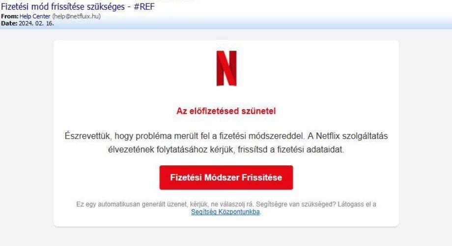 2024.02.19. – A Netflix nevében indított csalás nem sokat szötymög és rögtön a banki adataidat akarja megszerezni, egy első ránézésre hitelesnek tűnő levélben. A leginkább zavarba ejtő elem a szövegben az, hogy „Az előfizetésed szünetel”, ami minden Netflix user rémálma és kellően megijedhet tőle ahhoz, hogy hirtelen rákoppint a „Fizetési Módszer Frissítésére”. A levelet teljesen random dobálják szerte meg széjjel a csalók, viszont, ha épp’ egy Netflix előfizetéshez tartozó címre kapja valaki, ahová amúgy is szokott hírleveleket kapni a szolgáltatótól,