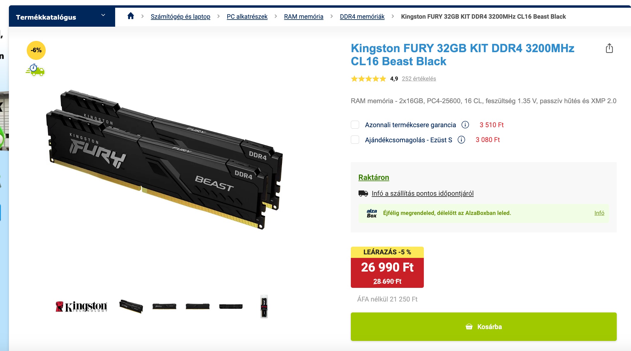 A legtöbb magyar webáruházban 32-31 ezer forint körüli vagy feletti áron mérik a Kingston Fury, 32 GB-os memóriáját 2024 nyarán, ám az Alza.hu-n remek akcióval találkozhatunk még néhány napig. Ez bizony azt jelenti, hogy 27 ezer forint alatt hozzájuthatunk, mely elérte a 2023 nyarán tapasztalt árakat.