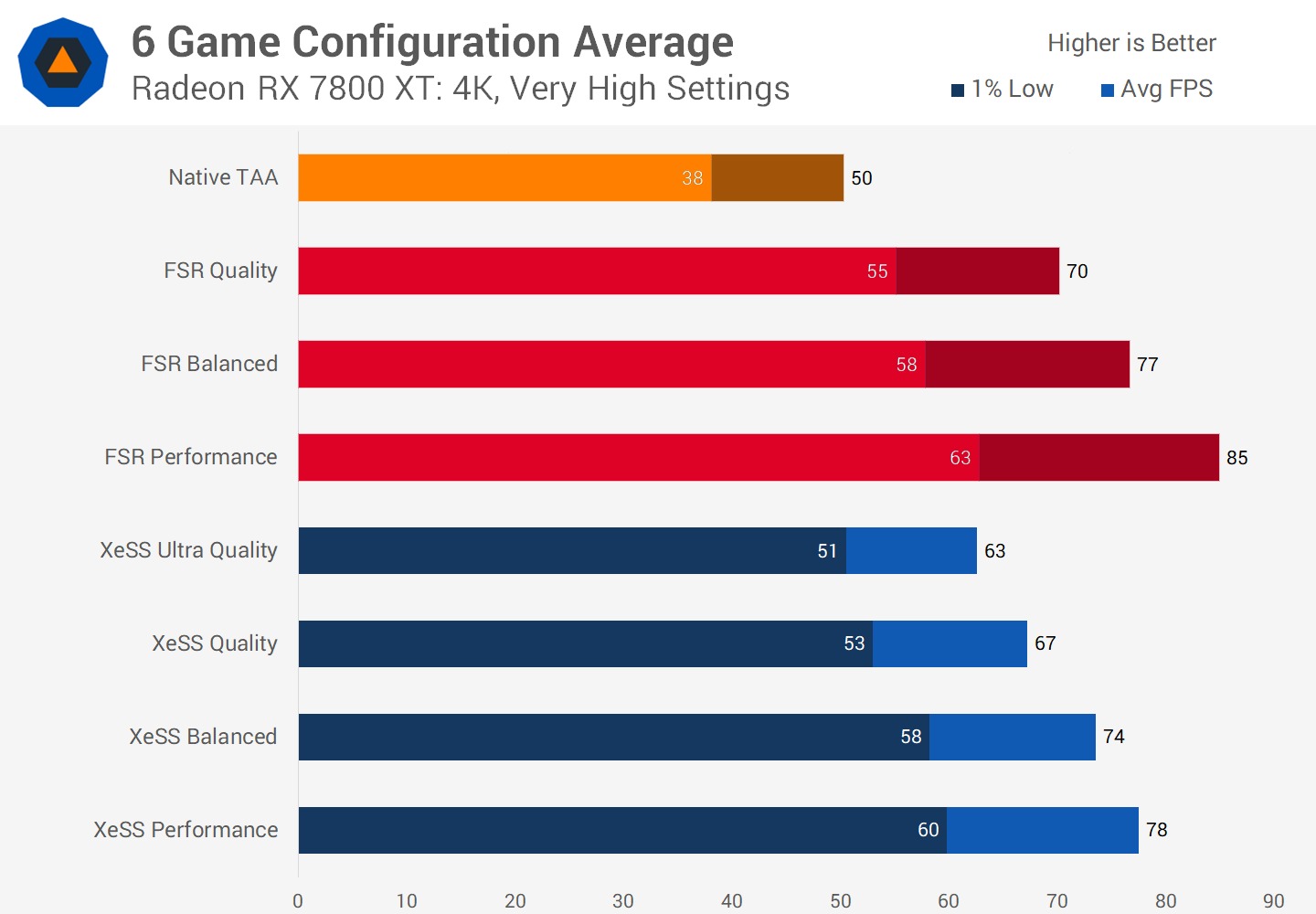 Első körben egy RTX 4070 és egy RX 7800 társaságában izzadtak az algoritmusok, megoldások. Több játékban is lefuttatta a tesztet a TechSpot csapata, ám az arányok megegyezőek voltak szinte minden címben, így nyugodtan nézhetjük a hat játékot felvonultató átlagokat is.