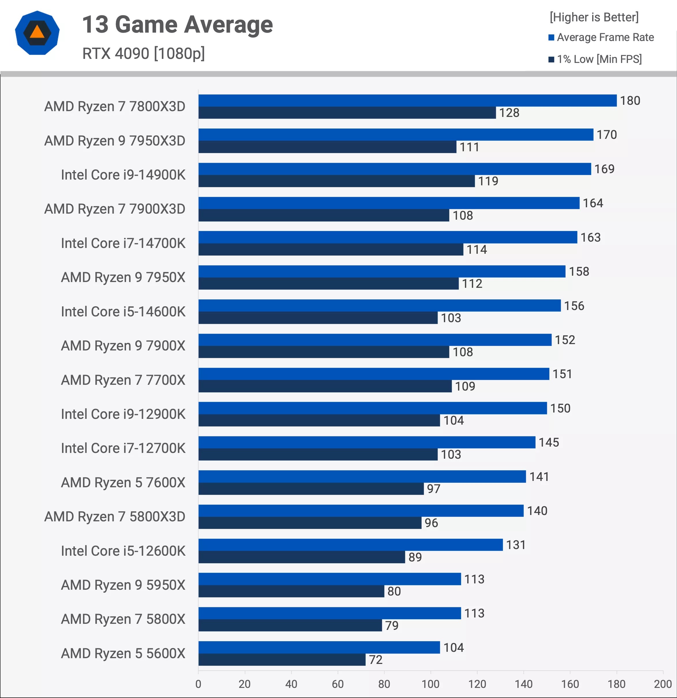 A processzorok egy RTX 4090 társaságában izzadtak, hogy garantáltan ne lehessen limitáló tényező a VGA. A felbontás pedig 1080p maradt. Ez sem véletlen. Egyrészt a játékosok nagyon jelentős része ezt a felbontás preferálja, másrészt 1440p és 4K felbontások esetében sok esetben már VGA-limitbe ütközünk még egy RTX 4090 mellett is.