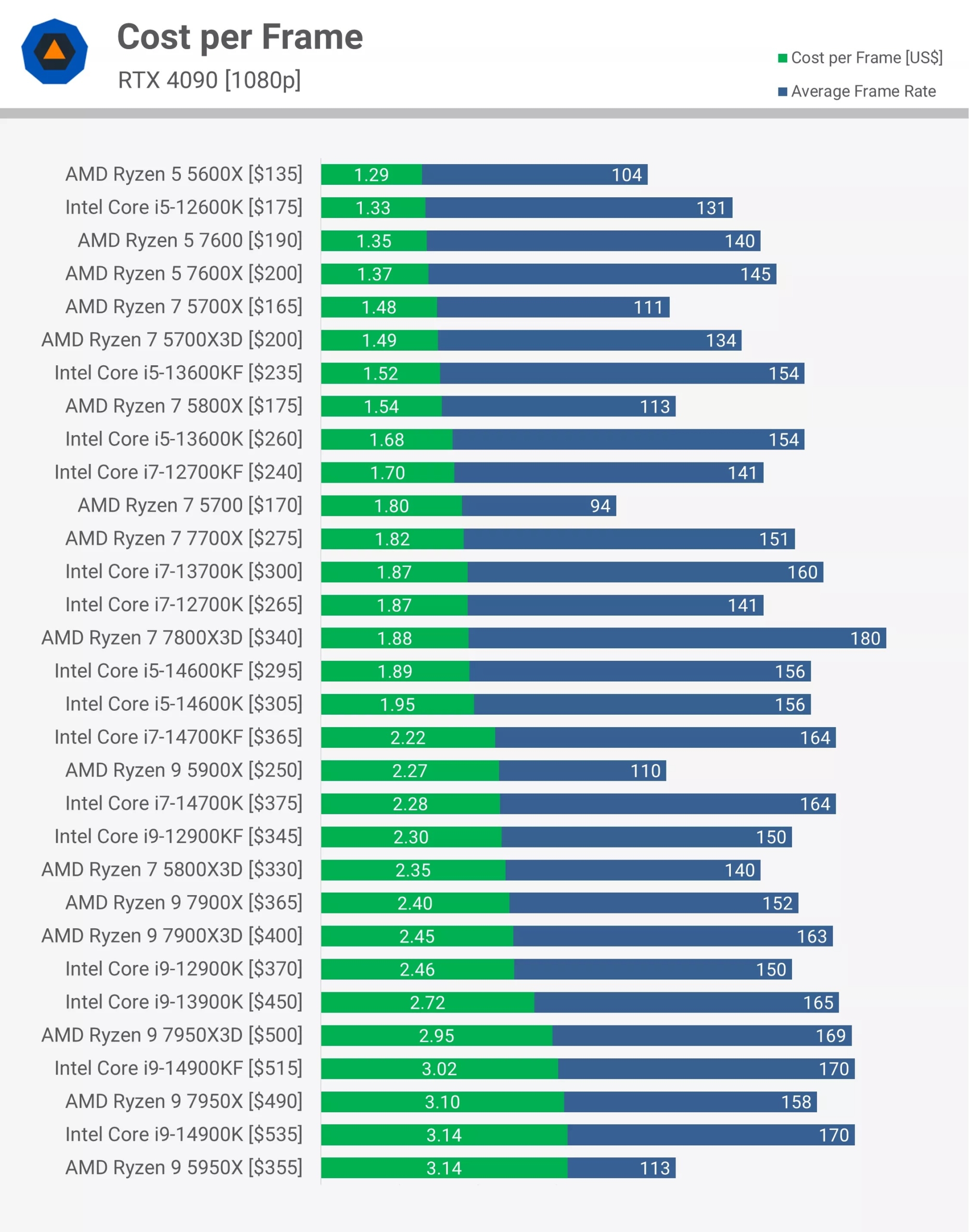 A TechSpot csapata jelentkezett egy igazán érdekes diagrammal is. Ebben a processzorok által kisajtolt FPS-t és a processzorok árait vetették egymásnak. Ezek adják meg az ár/képkocka arányt, azaz az FPS-enkénti költséget. Hazánkban nem teljesen ezeket az árcédulákat olvashatjuk le, ám az arányok teljes mértékben megegyeznek.