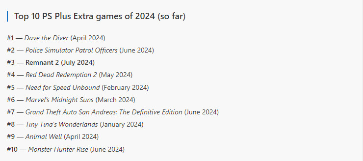 A TrueTrophies több mint 3,1 millió PlayStation Network fiókadat alapján megállapította, hogy a PS Plus Extra és Prémium játékok játékosainak száma 48,67%-kal csökkent 2024 júliusában a 2024 júniusi számokhoz képest. Ez a játékosszám-csökkenés eléggé jelentős, főleg hogy a Remnant 2 jelenleg a harmadik legnépszerűbb játék idén a szolgáltatásban. A Crisis Core: Final Fantasy 7 Reunion pedig 1171%-os növekedést produkált aktív játékosok számában, miután bekerült. Mindent összevetve azonban a július a harmadik leggyengébb hónap volt 2024-ben a PS Plus Extra és a Premium számára.