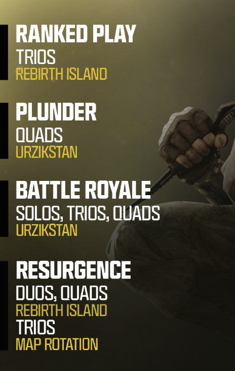 Azt már tudni lehetett a Season 5 Reloaded megérkezése előtt, hogy ezúttal a Resurgence mód is kaphat majd egy új variánst, ám továbbra is Urzikstan lesz a középpontban. A Season 3 során a játékosok szerint a sima, Battle Royale móddal nem is foglalkozott az Activision, így még Season 5 második felében is lesz mit bepótolni. Úgy tűnik ezt a kritikát is jogosnak érezték a programozók, remélhetőleg a negyedik után, az ötödik szezon is a kiegyensúlyozottabb szezonok sorát erősíti majd.