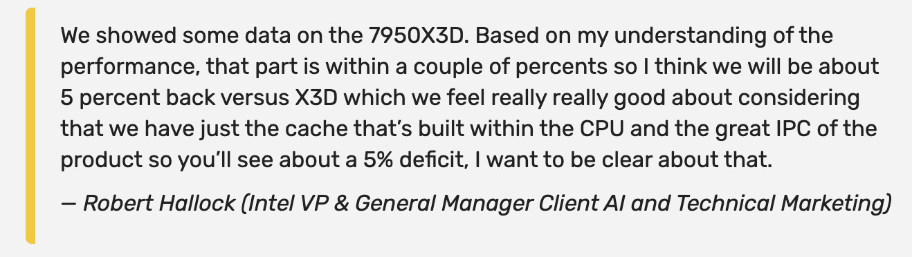 2024.10.12. – Az Intel nem is olyan rég, október 10-én terítette ki a kártyáit a legújabb generációs processzoraival kapcsolatban. Azon nyomban össze is gyűjtöttük a lényeges információkat. Az igazi próbatételre azonban október 24-én kerül majd sor, hiszen akkor kerülnek ki napvilágra a független, külsős tesztek. Az azonban mindenképp árulkodó, hogy az új processzorok játékban tapasztalható teljesítményét az Intel sem igazán fényezte. A Ryzen 9950X-el és az i9-14900K-val összehasonítva sem biztatóak az eredmények, a 3D V-Cache processzorokat pedig meg sem említették a végleges diasorokon.