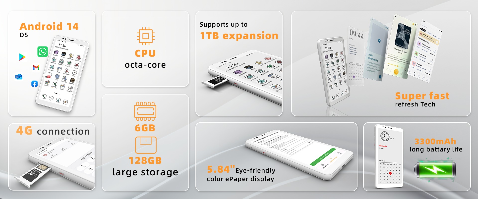 A szem fáradásának csökkentése mellett az akkumulátorok sokkal tovább bírják. A Bigme azt ígéri, hogy a 3300 mAh-s akkumulátor nagyon hosszú működést biztosít, de hogy pontosan mennyit, azt nem mondták még meg. Ha sötétben használjuk a 36 fokozatú kijelző-világítást, akkor gyakrabban kell tölteni. A készülékbe nyolcmagos processzor, 6 GB RAM és 128 GB tárhely került, ami microSD-kártyával 1 TB-ra bővíthető. A készülék Android 14 operációs rendszerrel érkezik.