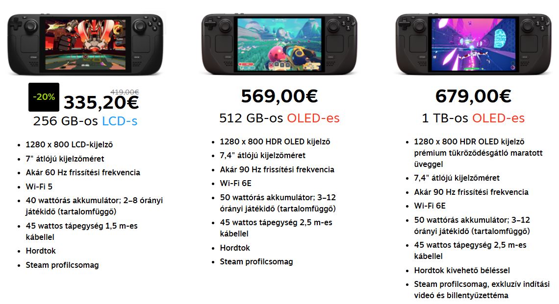 Az akciós Deck 7″-os, 1280×800 felbontású LCD kijelzővel, 60 Hz-es frissítéssel, 256 GB NVMe SSD tárhellyel, Wi-Fi 5 és Bluetooth csatlakozással, valamint egy 40 wattórás (2–8 óra játékidőt engedő) akkumulátorral rendelkezik. Íme, összehasonlítva a három most kapható típus: