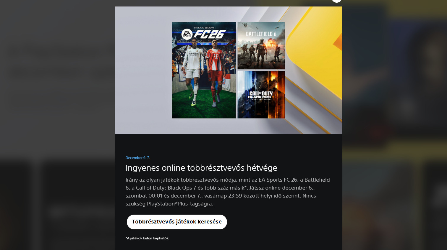 Jó kis hétvége lehet a következő, és nem csak azért, mert jön majd a Mikulás. Mindenki, akinek van otthon PlayStation, aktív PS Plus előfizetés nélkül is játszhat majd online minden olyan játékkal, ami már megvan a könyvtárban. Szóval akkor is pöröghet az online multiplayer azon olyan játékoknál, mint a Call of Duty: Black Ops 7, az EA Sports FC 26, ha nincs előfizetés. Persze ez csak egy korlátozott időszak.