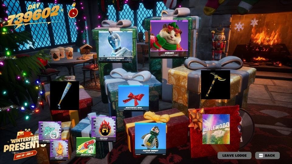 Az Epic Games nem változott a nyitási mechanikán sem. Minden nap egy Fortnite ajándékot lehet kinyitni, egészen január 4-ig lesz erre lehetőség. Az ajándékok az alábbi tárgyak valamelyikét rejtik magukban: