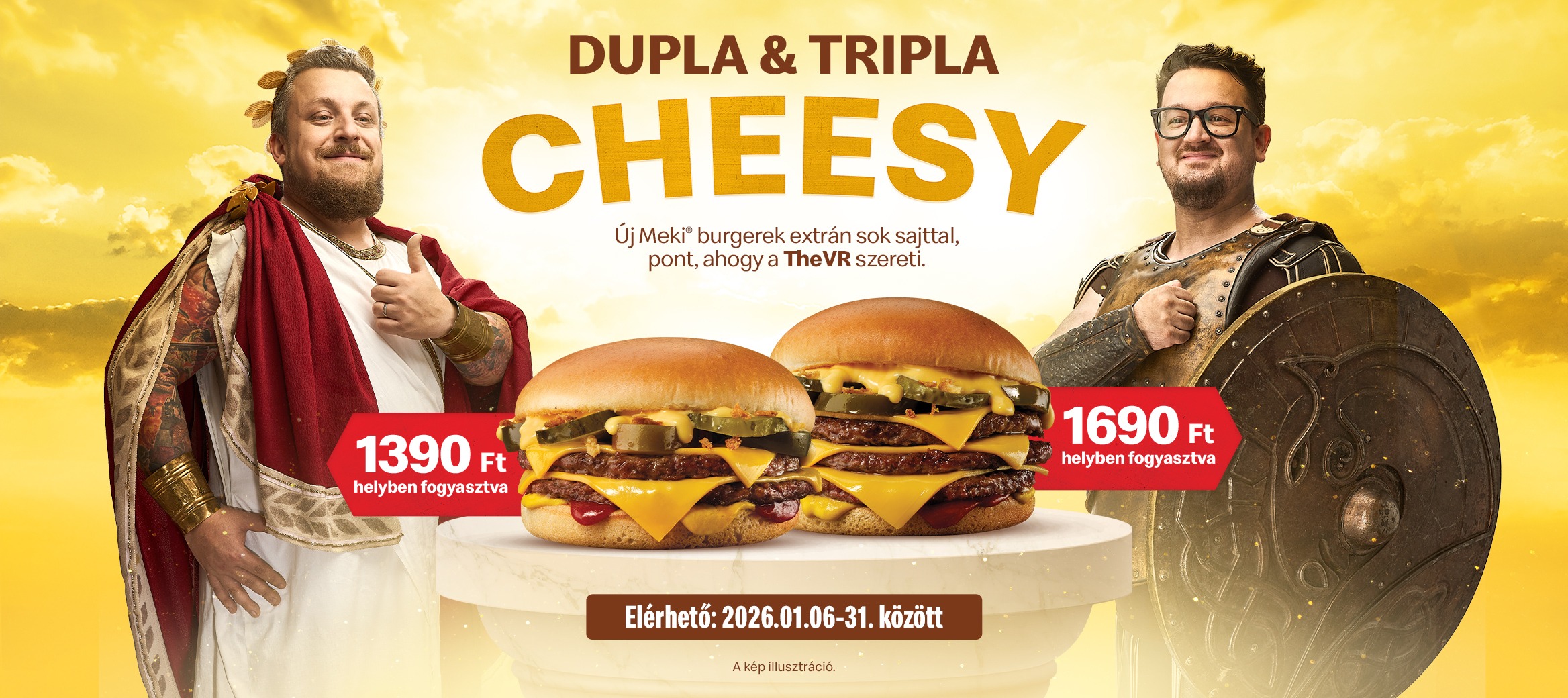 „Dupla és Tripla Cheesy burgerek, pont, ahogy a TheVR szereti: extrán sok sajttal, nacho sajtos szósszal, sült hagymával, szeletelt jalapeño paprikával, savanyú uborkával, hagymával, ketchuppal és mustárral. Baconnel turbóznád őket? Kérd a Dupla Cheesy Bacont vagy a Tripla Cheesy Bacont” – olvasható a Meki leírásában.