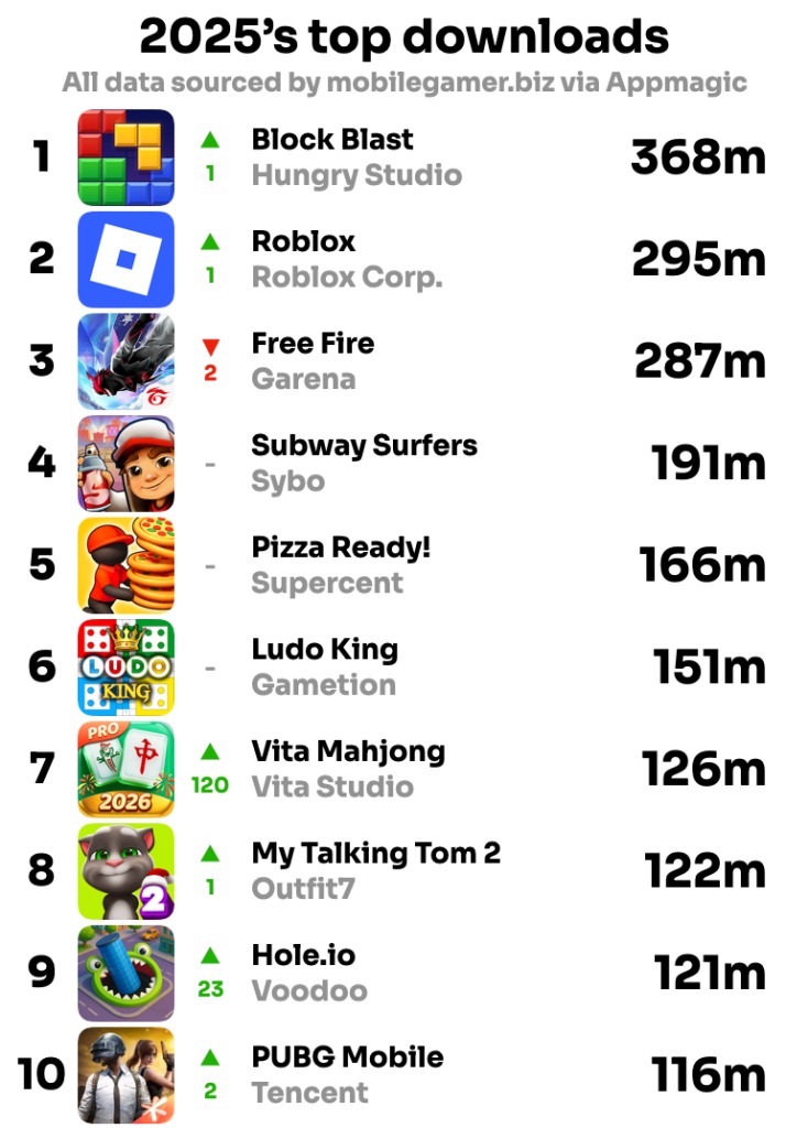 Nemrég az Appmagic kiadta 2025 legtöbbször letöltött játékainak listáját, amiből kiderül, hogy a Block Blast 368 millió letöltéssel lett az első, ami több mint 70 millióval haladja meg a Robloxot. Ez azt jelenti, hogy a Block Blast könnyedén megdöntötte saját 2024-es rekordját is, ami akkor 222 millió letöltés volt.