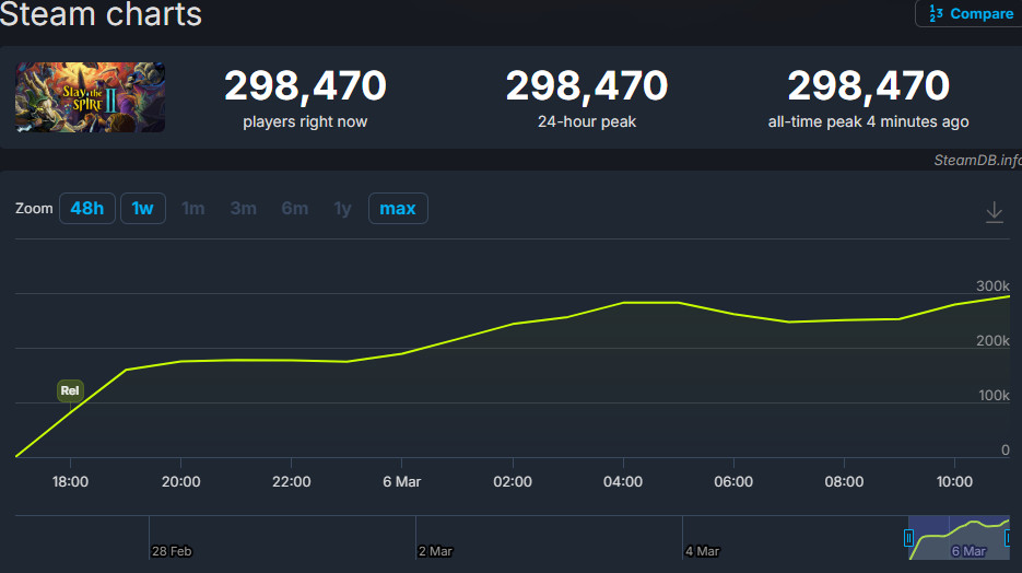 A SteamDB adatai alapján, a Slay the Spire 2-nek a cikk írásának pillanatában 298,470 aktív játékosa van. A Marathon eközben 31,526 aktív játékossal büszkélkedhet jelenleg.