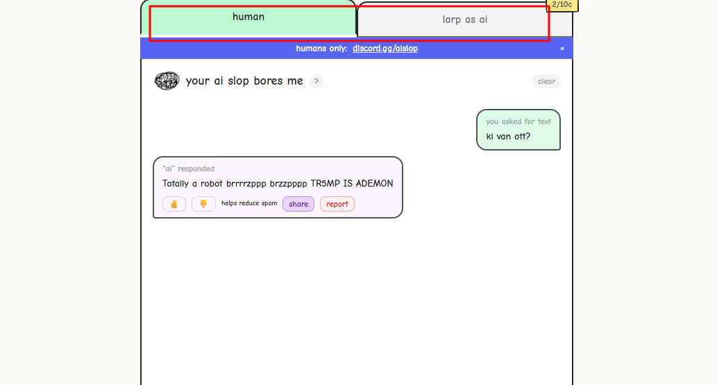 Az oldalra belépve alapvetően két lehetőség közül választhatsz. Vagy te kérsz valamit, és egy másik ember válaszol neked, ahogy akar. Vagy a „LARP mint AI módot ” választod, ahol kapsz egy kérdést/kérést és neked kell válaszolni másnak. Itt lehet rajzolgatni, persze más is rajzolgathat neked. Ezek valódi emberek, nincs AI, szóval ez egy közösségi móka. Emiatt az is előfordulhat, hogy sokat kell várni egy-egy válaszra, nyilván attól függően, hogy ki milyen sokat dolgozik egy válaszon. Ilyen vicces képek is születtek már.