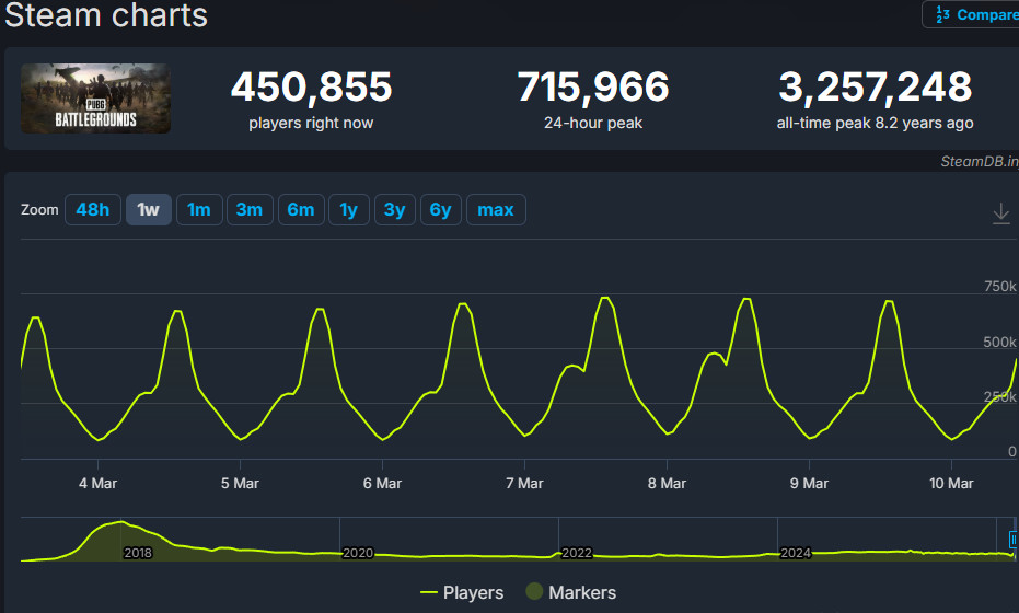 Tudom, hogy amikor a PUBG neve előkerül, sokan kiáltanak „halott játékot”, pedig ez egyáltalán nincs így. A játék még most is nagyon sikeres, ez nem múlt idő. A SteamDB és a SteamCharts adatai szerint a PUBG: Battlegrounds továbbra is a Steam egyik legnépszerűbb játéka. Az elmúlt hónapokban átlagosan nagyjából 270–290 ezer játékos játszik vele egy időben, míg a napi csúcs gyakran 600–700 ezer egyidejű játékos körül alakul.